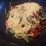 Kook intussen de noedels volgens aanwijzingen op de verpakking. Zodra ze klaar zijn afgieten en koud spoelen en laten uitlekken.