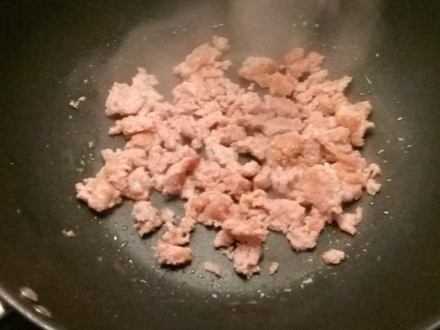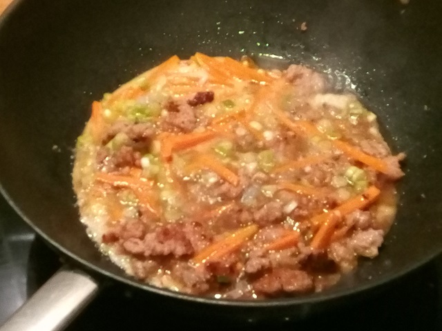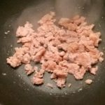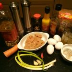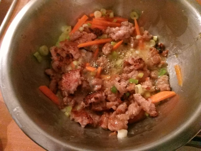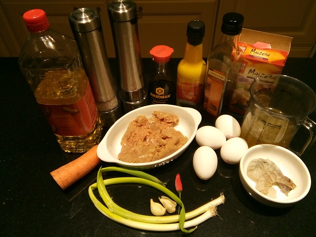 Verhit 1 el olie in een wok en bak het kipgehakt rul. Heb je geen kipgehakt snijd dan kippendij zo klein mogelijk. Bak 1 à 2 minuten. Voeg dan de knoflook toe met de stukjes garnaal. Bak nog een minuut of 2. Haal dan uit de wok en laat even afkoelen.