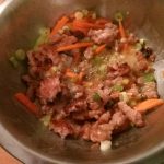 Kluts in een kom de eieren. Voeg dan alle gesneden groentes toe met de gebakken kip en garnalen.