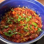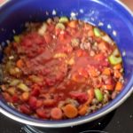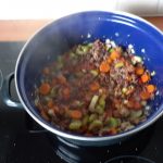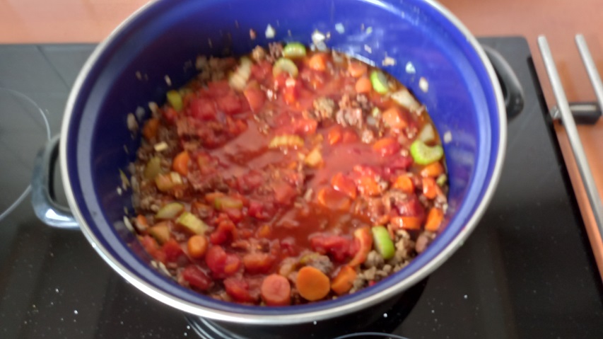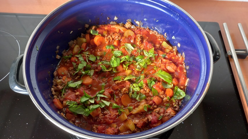 Zet het vuur lager en laat het geheel 70 minuten zachtjes sudderen onder af en toe roeren.. Voeg dan de basilicum toe en roer goed door.