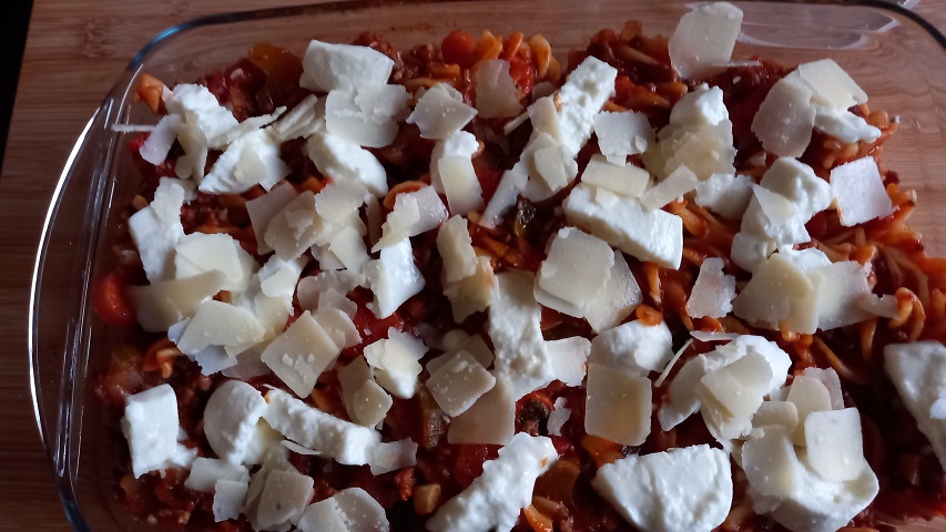 Verdeel de stukjes mozzarella en de Parmezaan-schilfers over de ovenschaal en zet in de oven om te gratineren.