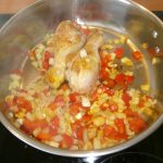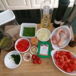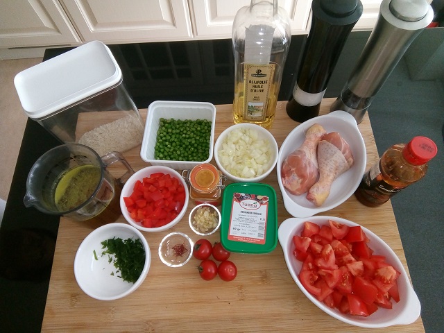 1. Zet alle ingrediënten klaar. Pel en snipper de ui en knoflook. Snijd de tomaten in blokjes. Maak de paprika schoon en snijd deze in blokjes. Hak de peterselie fijn. Stamp in een vijzel de saffraandraadjes tot poeder en los deze dan op in een beetje water.