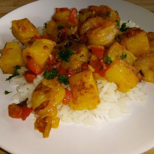 Verdeel de rijst over de borden. Schep daar het garnalenmengsel over en strooi er wat peterselie over.