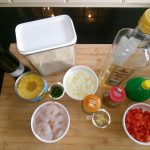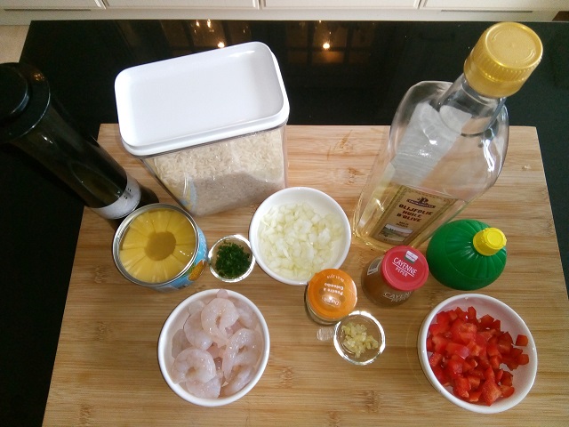 Zet alle ingrediënten klaar. Pel en snipper de ui en de knoflook. Snijd de paprika eerst in reepjes en vervolgens in blokjes. Snijd de peterselie fijn. Pel de gamba's en verwijder het darmkanaaltje. Kook de rijst volgens aanwijzing op de verpakking.