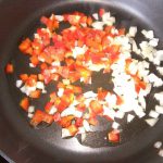 Verwarm een scheutje olijfolie in een koekenpan en voeg de ui en paprika toe. Bak totdat de ui glazig is en de paprika wat zachter is geworden.