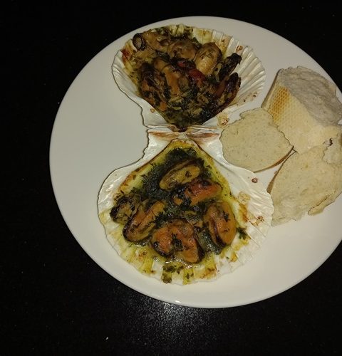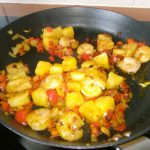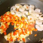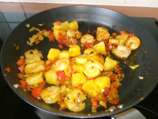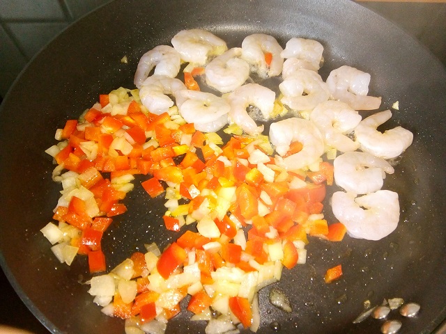 Voeg de gamba's en de knoflook toe. Voeg de kruiden en wat zout toe. roer goed door elkaar. Zodra de gamba's aan een kant mooi gekleurd zijn draai ze dan om.