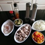 1. Zet alle ingrediënten klaar. Pel en snijd de ui in ringen. Snijd de paprika's en de courgette in blokjes.