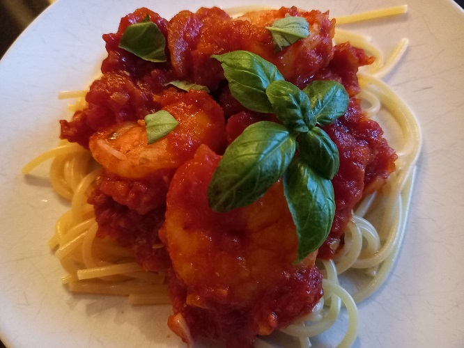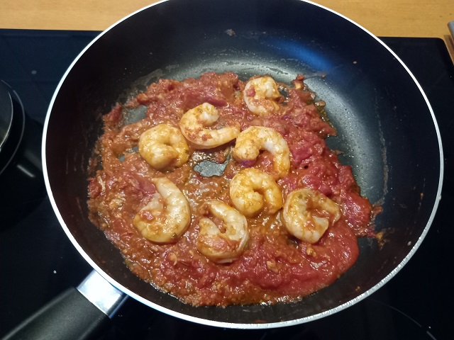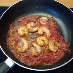 Voeg de garnalen toe en vermeng deze met de saus Zet het vuur wat hoger en doe de deksel weer op de pan. Laat nog 10 minuten zachtjes stoven zodat de garnalen garen. Proef de saus en breng zonodig verder op smaak met zout en cayennepeper