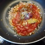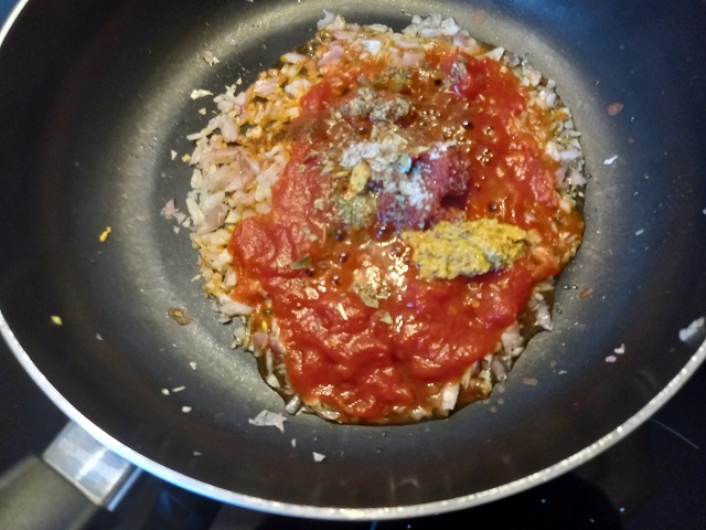 Verhit de olie in een pan en fruit de sjalot tot deze glazig begint te worden. Voeg dan de knoflook toe en laat een half minuutje mee fruiten. Voeg dan de tomaten met het sap, tomatenpuree, azijn, basilicum, cayenne peper, mosterd, zou en het suiker toe. Breng aan de kook en doe het deksel op de pan. Laat een kwartiertje op laag vuur stoven.