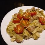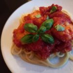 Verdeel het gerecht over de borden en garneer met verse basilicum. Geef er pasta of rijst bij.