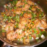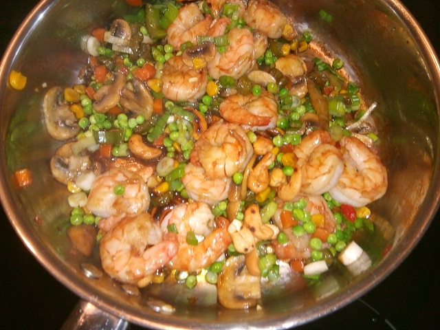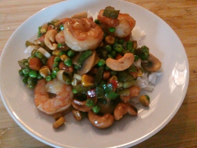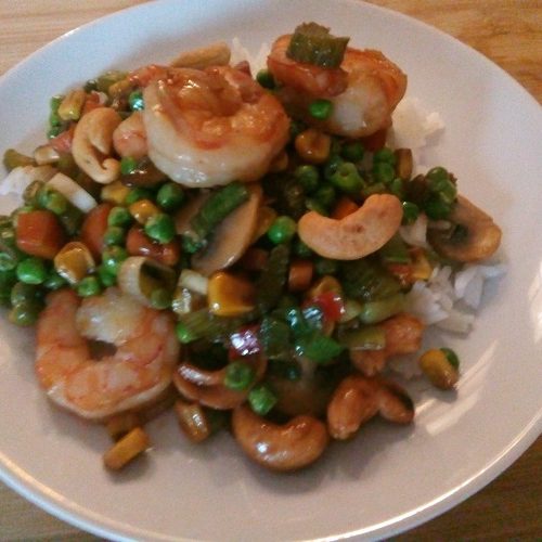6. Verdeel de rijst en het garnalenmengsel over de borden en garneer met de cashewnoten.