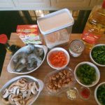 1. Zet alle ingrediënten klaar. Snijd de bosui in kleine ringetjes. Snijd de bleekselderij in ringetjes. Pel en snipper de knoflook. Snijd het stukje rode peper over de lengte doormidden en verwijder de zaadlijsten en de pitjes. Snijd vervolgens in kleine stukjes. Snijd de wortel in stukjes. Snijd een stukje van het steeltje van de champignons. Verwijder eventueel vuil met een stukje keukenpapier en snijd in plakjes. Pel zo nodig de garnalen en verwijder het darmkanaaltje.