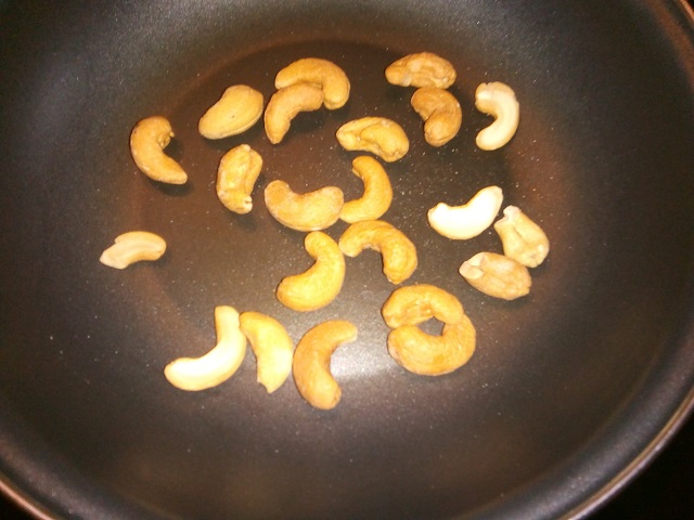2. Verwarm een koekenpannetje en rooster de cashewnoten. Bewaar ze voor later.