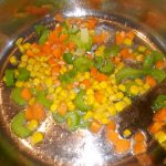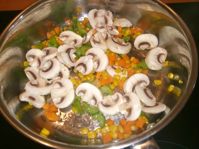 3. Verwarm de olie in een koekenpan en bak 3 à 4 de wortel, bleekselderij en de mais. Roer af en toe door.
