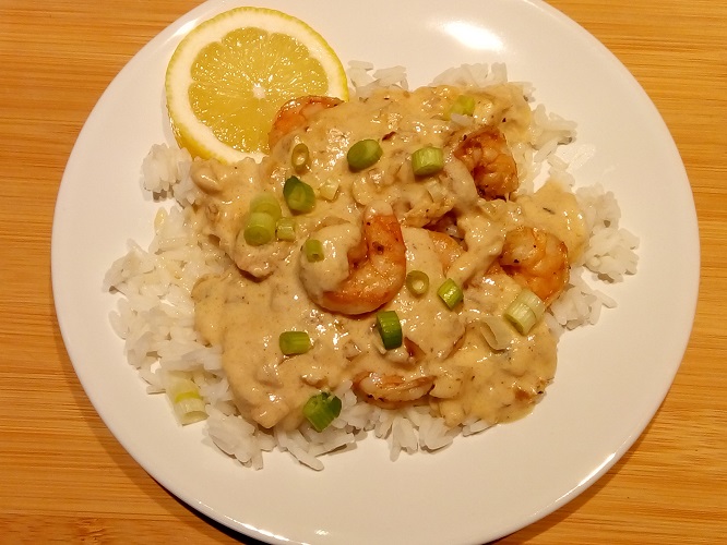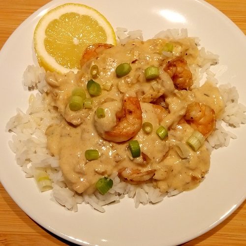 Verdeel de rijst en de garnalen over de borden en verdeel hier de saus over. Snijd de citroen in plakjes en leg deze naast het gerecht op het bord. Garneer met de lente ui ringetjes.
