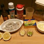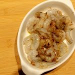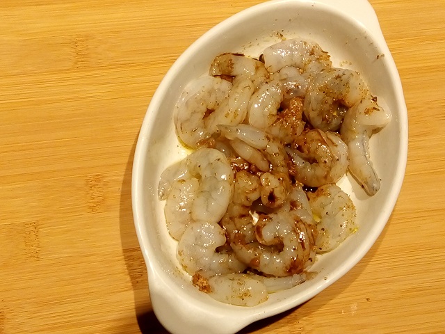 Meng de garnalen met de andere helft van de kruiden en worcestershiresaus en de 1 el olijfolie. Meng door elkaar.