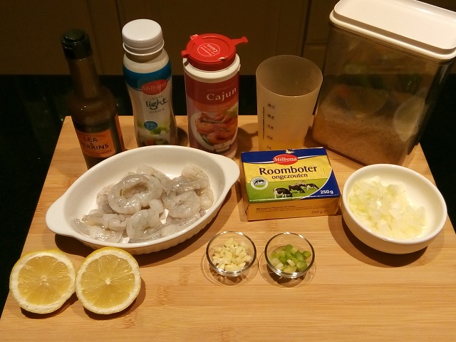 Zet alle ingrediënten klaar. Pel en snipper de ui en de knoflook. Snijd de lente ui in ringetjes. Pel, indien nodig, de garnalen en verwijder het darmkanaaltje.