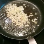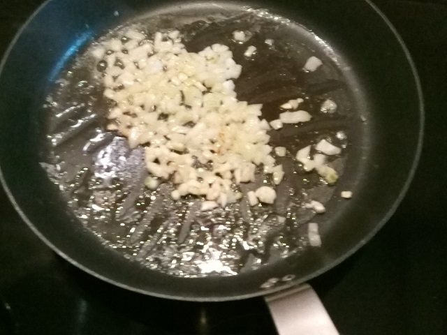 Verhit de boter in de koekenpan en fruit de ui tot deze glazig ziet. Voeg dan de knoflook toe en laat deze een minuutje mee fruiten.