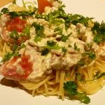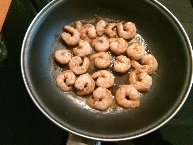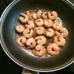 Verhit een tweede koekenpan en bak hierin de garnalen aan beide zijden totdat ze mooi roze zijn. Bak ze niet te lang anders worden ze rubber achtig.