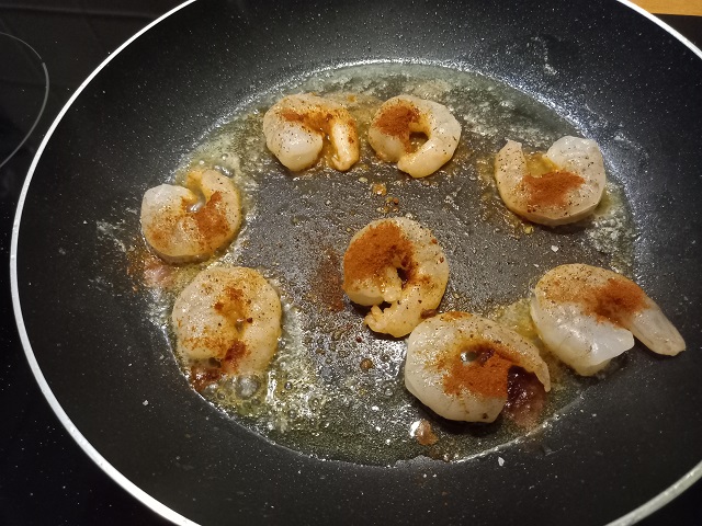 1. Verhit op middelhoog vuur de helft van de boter en de olijfolie. Bak de garnalen gedurende 1 minuut en bestrooi ze dan met wat zout en peper. Verdeel de paprikapoeder over de garnalen.
