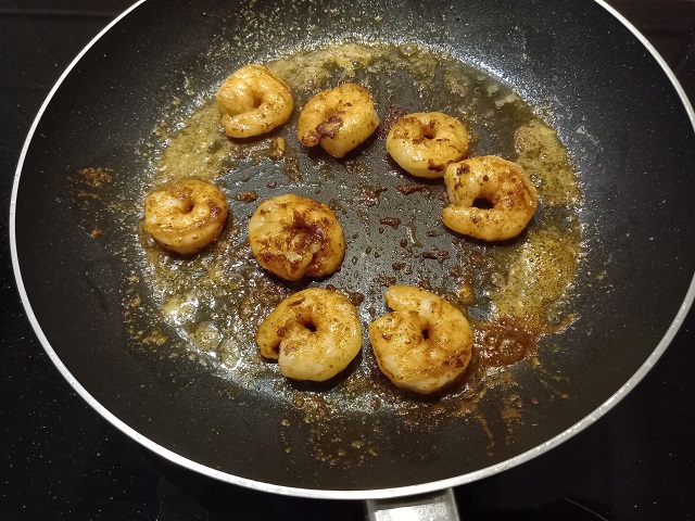3. Bak de garnalen verder tot deze mooi roze is en keer ze dan om de andere zijde te bakken. Haal uit de pan en bewaar onder aluminiumfolie.