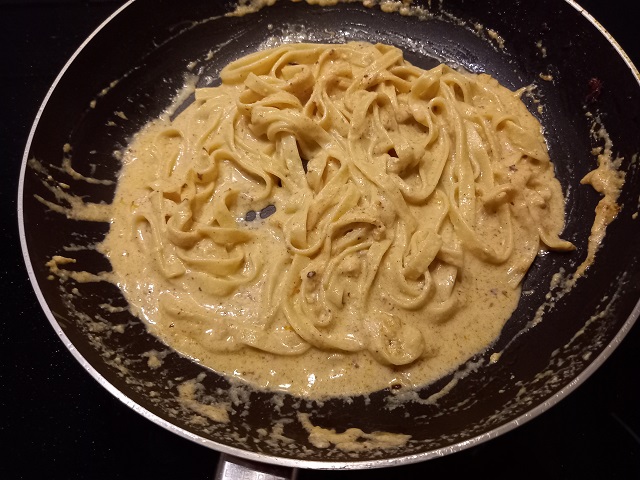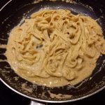 6. Giet de pasta af maar bewaar wat van het kookvocht. Roer de pasta door de saus. Is de saus wat te dik verdun hem dan met een scheutje van het kookvocht. Proef en breng eventueel verder op smaak met zout en peper.