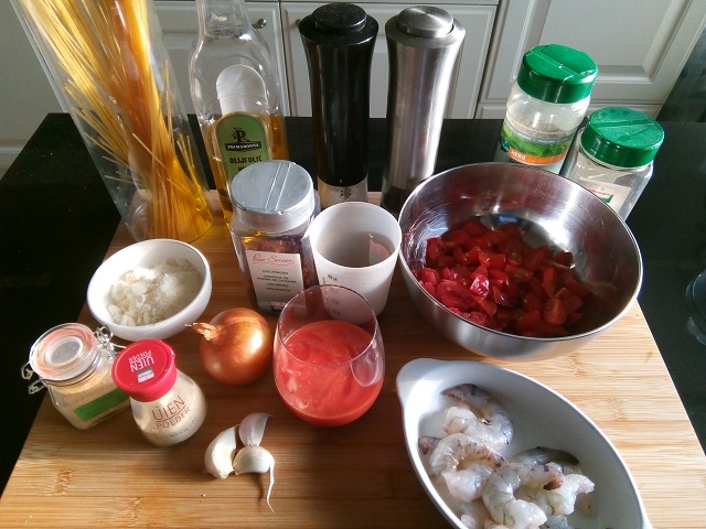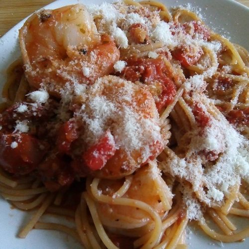 Garnalen met knoflook pasta in rode wijn tomaten saus