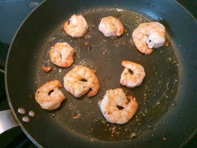 2. Verhit 1 el. olijfolie in een koekenpan en bak de garnalen 2 minuten per zijde of tot ze mooi roze zijn. Haal ze uit de pan en bewaar op een bordje onder aluminiumfolie.