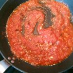 2. Voeg de wijn en de tomatenblokjes toe. Breng aan de kook. Voeg nu de basilicum, knoflookpoeder, uienpoeder, Italiaanse kruiden en wat zout toe. roer het geheel goed door elkaar. Draai de warmte bron laag en laat zachtjes koken terwijl de pasta in de volgende stap gekookt wordt.
