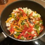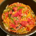 Pel en snipper de ui. Verwijder, de steel het wit en de pitjes van de paprika’s en snijd ze in fijn repen. Snijd de tomaat in blokjes. Pel de knoflook en snijd deze fijn. Verhit de olijfolie in een pan en fruit de ui met de paprika aan. Voeg de paprikapoeder met wat zout toe. Zet het vuur wat lager en voeg de knoflook toe.