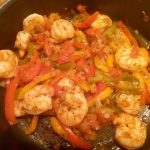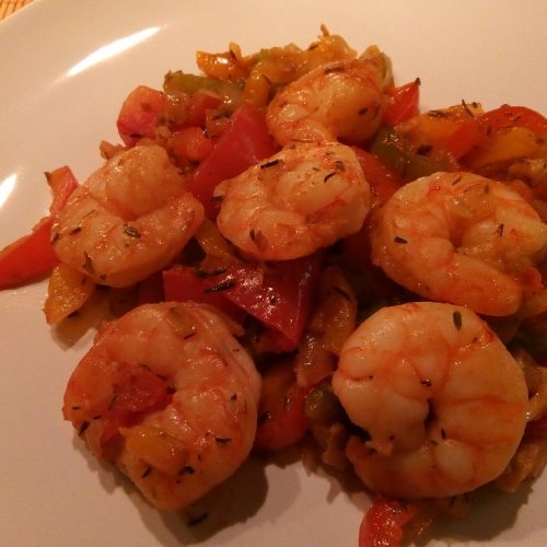 Voeg de garnalen toe, doe een deksel op de pan en laat 5 minuten garen. Draai de garnalen om en bestrooi met piment d’espelette naar smaak. Roer het geheel door en laat nog een paar minuten stoven met het deksel op de pan.
