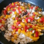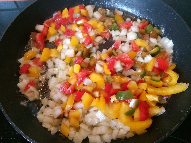 Verhit in een koekenpan de boter en de olie. Fruit de ui tot deze glazig ziet. Voeg dan de knoflook en de paprikablokjes toe. Bak deze tot ze wat zachter zijn.