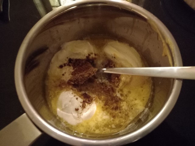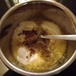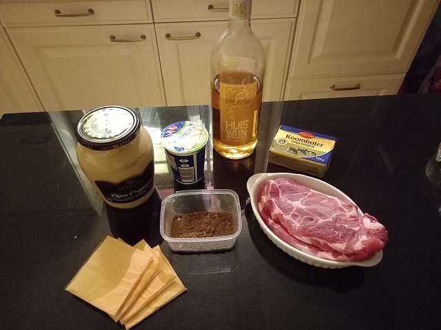 Men de witte wijn, crème fraîche, mosterd en de bbq kruiden door de gesmolten boter.