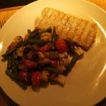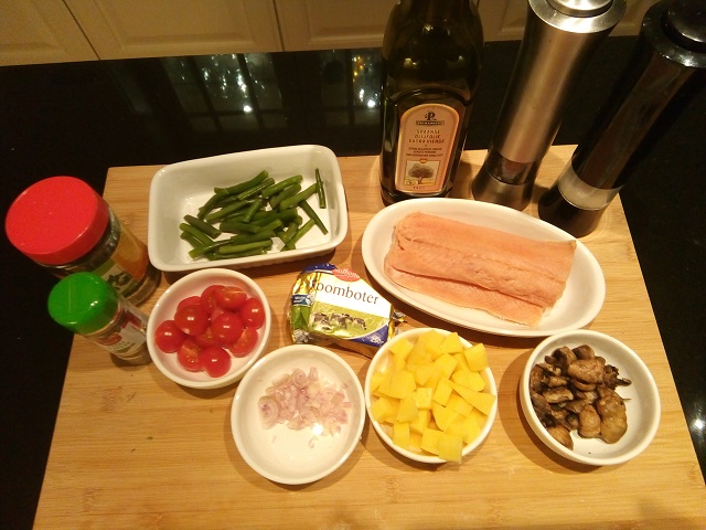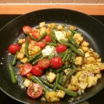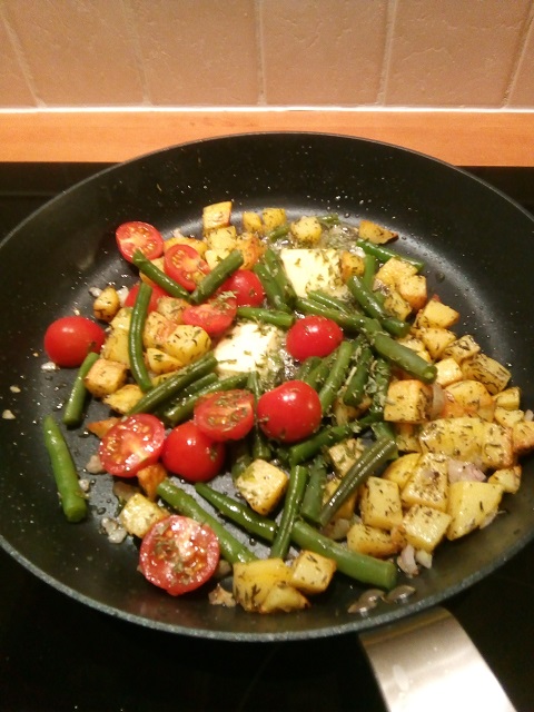 Zodra de aardappelblokjes beginnen te kleuren voeg dan de sjalot, tomaatjes en de sperciboontjes toe. Breng op smaak met zout en peper. Voeg de boter en de peterselie toe. Verlaag de warmtebron en laat rustig garen. Ik had nog wat gebakken champignons over van een ander gerecht en heb dit ook nog toegevoegd. Breng op smaak met wat zout en peper.