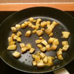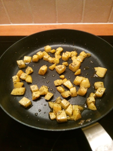 Verhit de olie in een koekenpan en bak de aardappelblokjes aan alle kanten aan. Voeg de tijm toe.