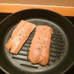 Verhit een grillpan. Smeer de zalmmoten licht in met wat olie. Grill de zalmmoten in de grillpan. Bestrooi met wat zout en peper.