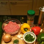 Zet alle ingrediënten klaar. Pel en snipper de ui en de knoflook.