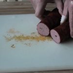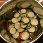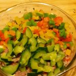 Snijd de courgette in plakjes en daarna in stukjes. Verwijder de stelen en de pitjes van de paprika. Verwijder zoveel mogelijk van het wit. Snijd de paprika's in reepjes en dan in blokjes.