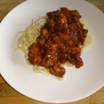 Verdeel de noedels over de borden. Verdeel daar de gekruide kip over. Besprenkel met de sesamolie.