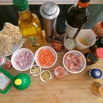 Zet alle ingrediënten klaar. Pel en snipper de knoflook en de sjalotjes. Schil de wortel en gember. Snijd de wortel in julienne. Snijd de gember fijn. Snijd de kippendij in blokjes.