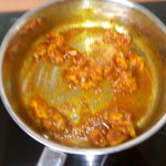 Doe de kipblokjes terug in de pan. Voeg de tomatenpuree, sojasaus, vissaus en wat peper toe. Giet de bouillon, limoensap en de wijn toe. Laat 10 minuten zachtjes koken.