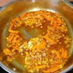 Bak in dezelfde pan nu de wortel, gember, knoflook, sjalotjes en de sambal. Laat dit een minuut of 5 zachtjes bakken.