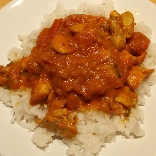 6. Roer goed door elkaar en laat nog even warm worden. Verdeel de rijst en de kipkerrie over de borden.