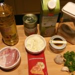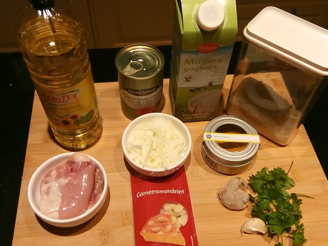 1. Zet alle ingrediënten klaar. Pel en snipper de ui en snijd deze in halve ringen. Pel en snipper de knoflook. Rasp de gember. Snijd de kip in blokjes. Snijd de peterselie grof.