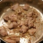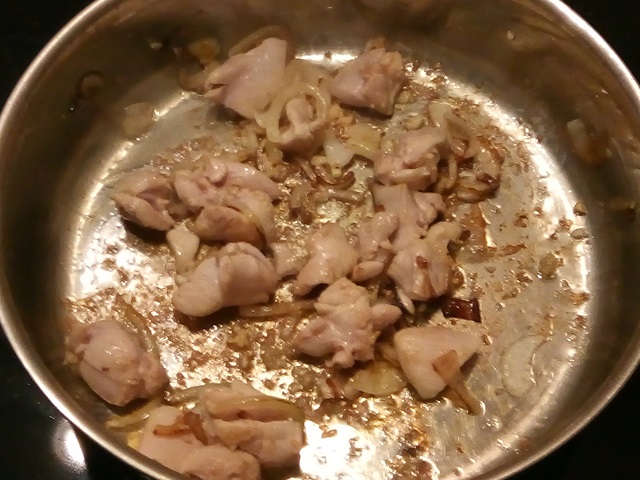 2. Verhit 1 el. olie in een hapjespan en fruit de ui. Zodra deze glazig is voeg dan de knoflook en de gember toe. Laat 1 minuut mee fruiten. Verhit de rest van de olie en bak de kipblokjes. Voeg na een minuut of 5 de kerriepoeder toe en laat deze even meebakken zodat deze zijn smaak kan afgeven.