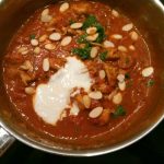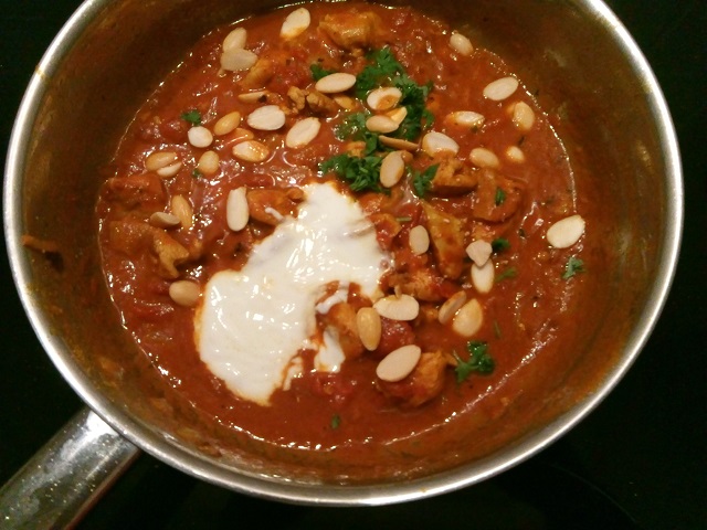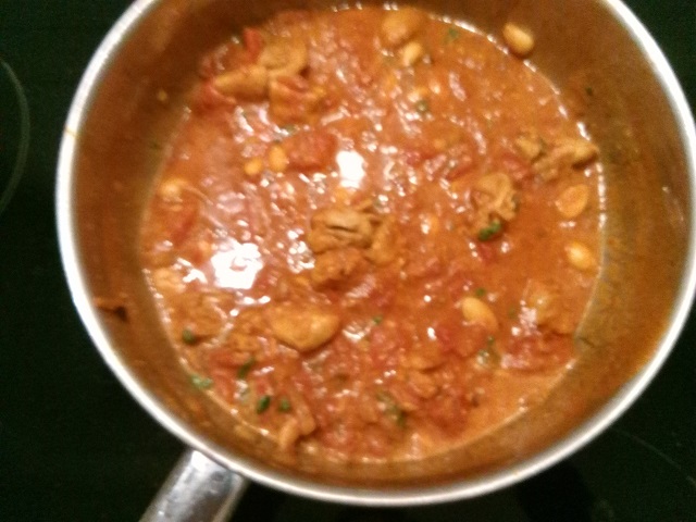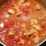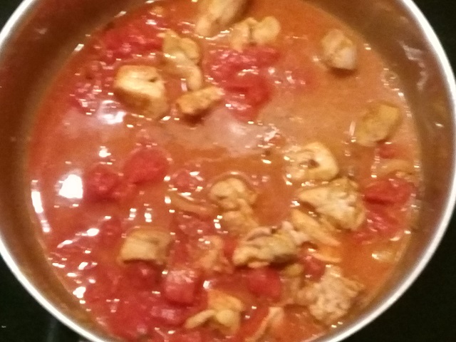 3. Giet de tomatenblokjes met het sap bij het kipmengsel samen met het water. Breng aan de kook en laat een minuut of 20 inkoken.