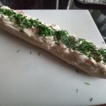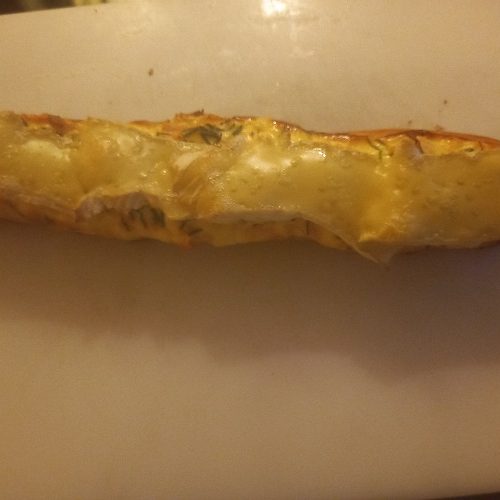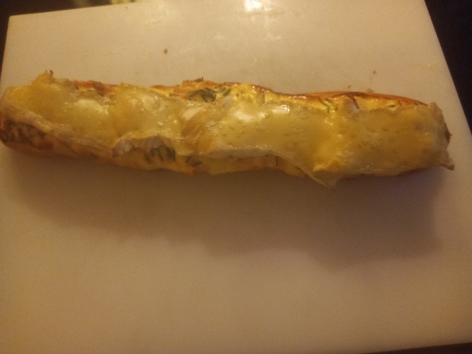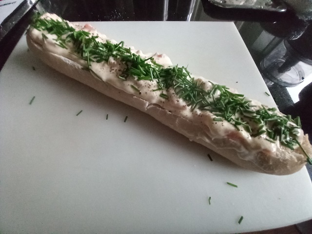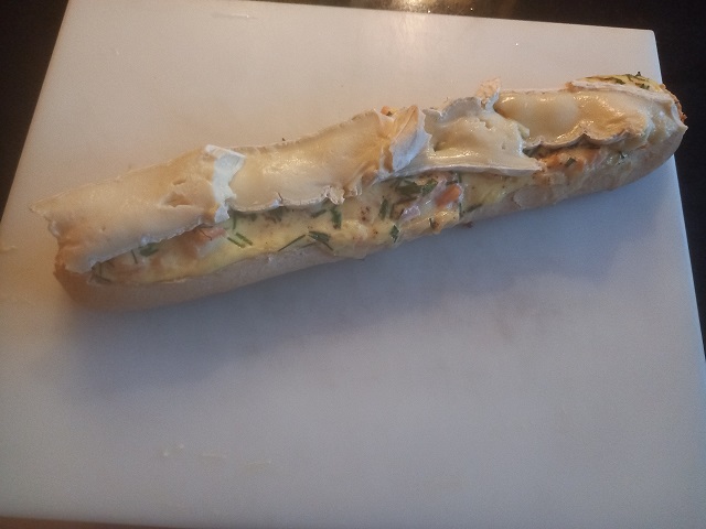 Snijd met een broodmes een v uit de lengte van het stokbrood. Vul het stokbrood met het zalm mengsel. Zet in de oven en laat dit 15 minuten bakken. Snijd de brie in plakjes.