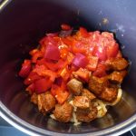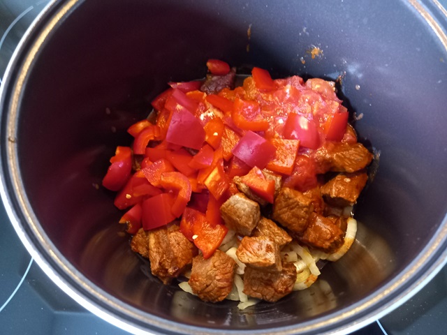 Verwarm de andere el. olijfolie en bak het rundvlees gedurende een paar minuten tot ze bruin is. Voeg de tomatenpuree en het paprikapoeder toe. Voeg dan de bouillon toe. Breng aan de kook en doe het bij de ui in de slowcooker. Voeg de tomatenblokjes en de paprika toe. Bestrooi met zout en peper. Sluit de pan en kook 6 op laag of 4 uur op hoog.