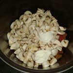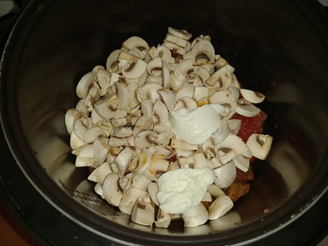 Voeg in het laatste half uur de champignons en de zure room toe. N de kooktijd proef en voeg eventueel nog wat chilipoeder toe.