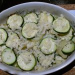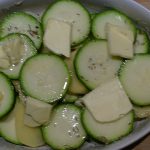 Beboter een ovenschaal. Prik de teen knoflook aan een vork en wrijf de beboterde schaal in. Leg de schijfjes aardappel en courgette afwisselend in de schaal. Giet de bouillon erover. Voeg wat zout, peper en tijm toe Sprenkel de olijfolie over het mengsel. Verdeel een paar klontjes boter over de aardappel en courgette.